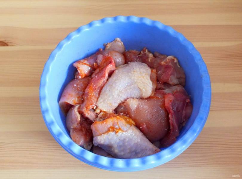 Курицу вымойте, промокните бумажным полотенцем. Нарежьте на средние кусочки. При желании можно снять кожицу. Она во время жарки сильно обгорает. Переложите куски курицы в чашу. Посыпьте специями, солью. Перемешайте.