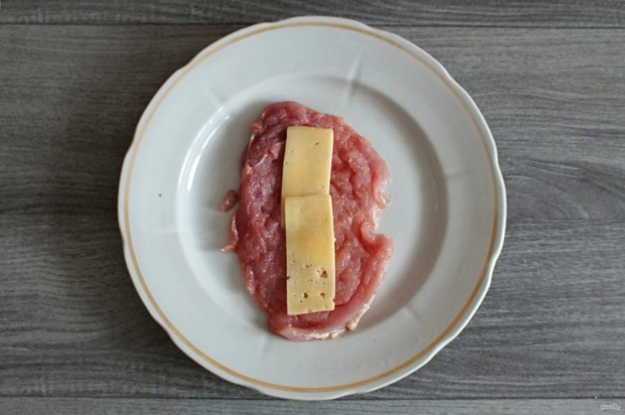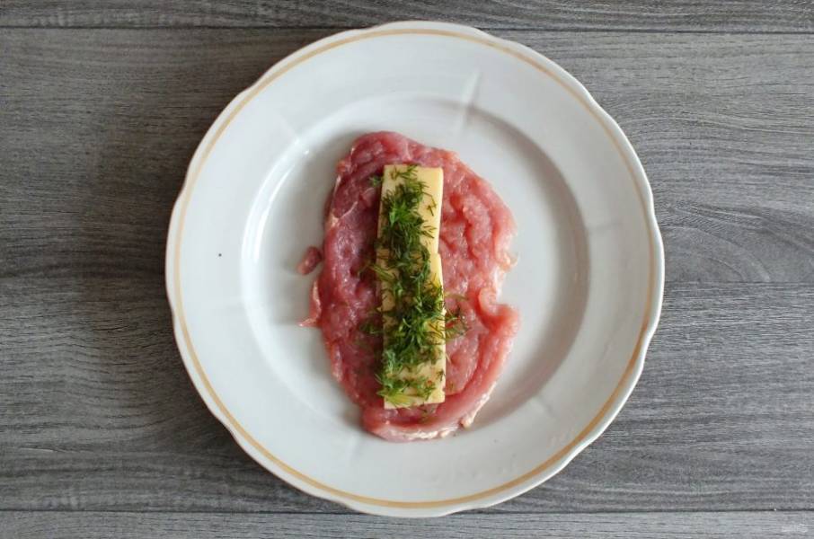 Сформуйте шашлык. Он состоит из отдельно скрученных отбивных. Для этого возьмите отбитый кусок мяса. Присолите слегка. Выложите на него сыр.