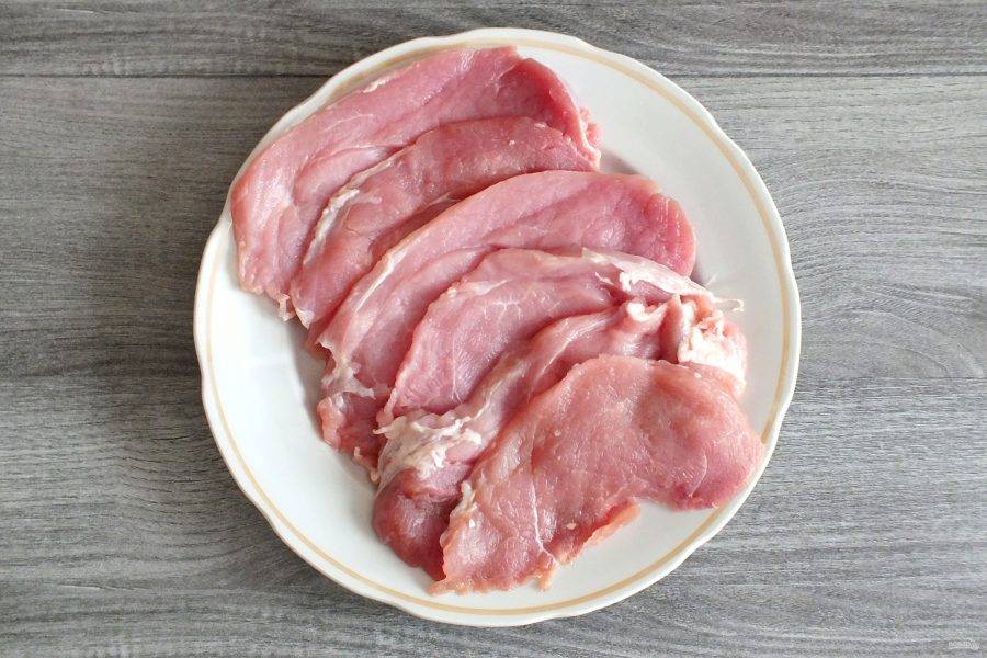 Отбейте мясо молоточком, стараясь не порвать. Переложите отбивные в чашу с маринадом. Перемешайте. Оставьте на 10 минут, не более.