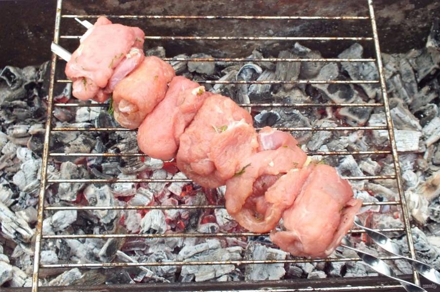 Подготовьте мангал. Как только угли будут "седыми", выложите шампур с мясом на решетку. Обжаривайте, периодически переворачивая, до румяной корочки. Время обжаривания может зависеть от погодных условий.