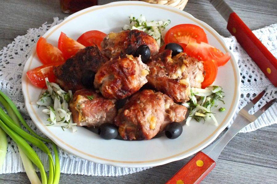 Готовность шашлыка можно определить проткнув его ножом. Если выделяется светлый сок, без примеси крови, можно снимать с огня.