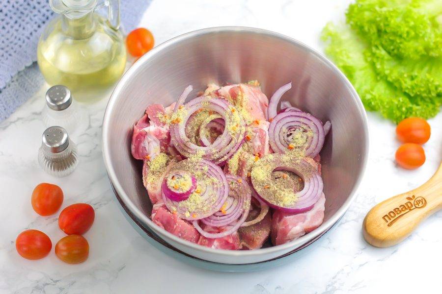 Подготовьте указанные продукты. Выбирайте либо свиную шею, либо подчеревок — в них есть сальные прожилки и поэтому шашлык получится сочный, вкусный.
