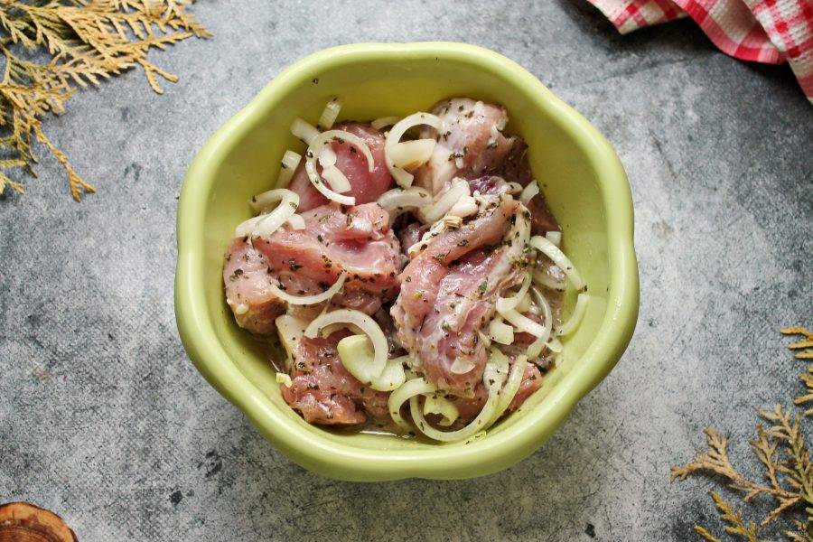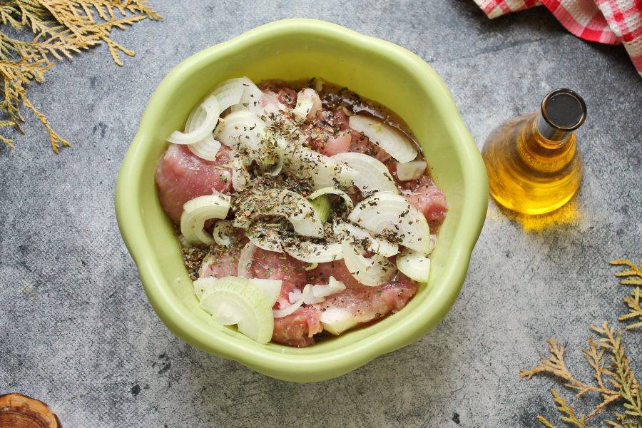 Репчатый лук почистите и порежьте полукольцами. Мясо посолите, поперчите, добавьте порезанный лук, специи и перемешайте.