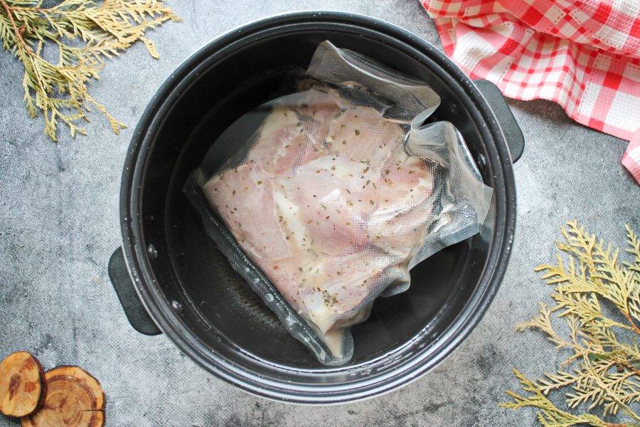 В чашу мультиварки налейте воду и полностью погрузите пакет с мясом. Установите режим "Мультиповар", время 2 часа и температуру 70 градусов. После приготовления остудите до теплого состояния.