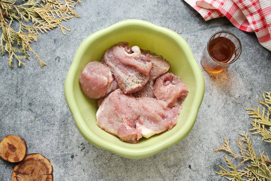 Свинину вымойте и обсушите салфеткой, порежьте на одинаковые куски поперек волокон. Выложите мясо в миску.