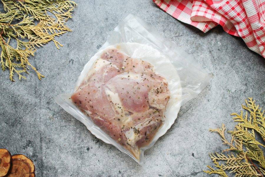 Счистите с мяса лук и маринад, выложите в специальный пакет для вакууматора. При помощи прибора удалите из пакета воздух и запаяйте.