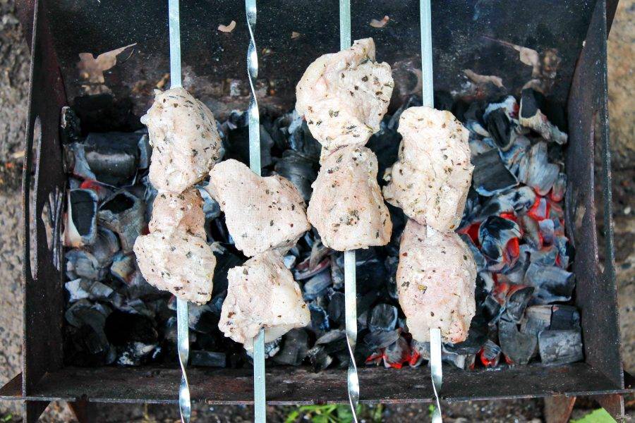 В мангале разведите угли. Готовый шашлык нанизайте на шампуры и быстро обжарьте на сильных углях со всех сторон до румяной корочки. Сразу снимите шашлык с огня и подавайте.