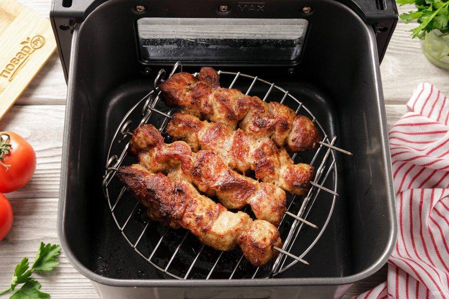 Установите шампура на специальной решётке. Я готовлю при температуре 200 градусов в течение 20 минут, не переворачивая. Ориентируйтесь на свой прибор, возможно у вас уйдёт чуть больше или меньше времени, самое главное — не пересушить. Минут через 10 обязательно достаньте чашу и проверьте, чтобы сориентироваться по времени, если готовите в первый раз.