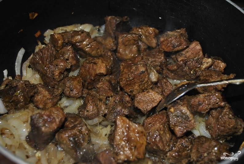 Мясо порезать на кусочки такой величины, как вы обычно нарезаете для шашлыков. Посолить, посыпать перцем и зирой.