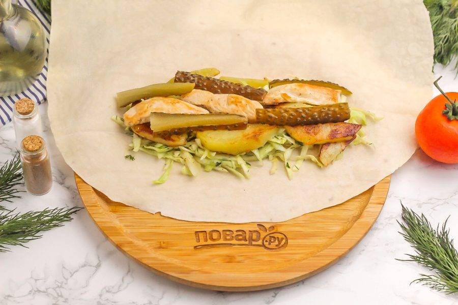 На них — обжаренные ломтики куриного филе или другого мяса, которое вы выбрали, а также — соленые или маринованные огурцы.