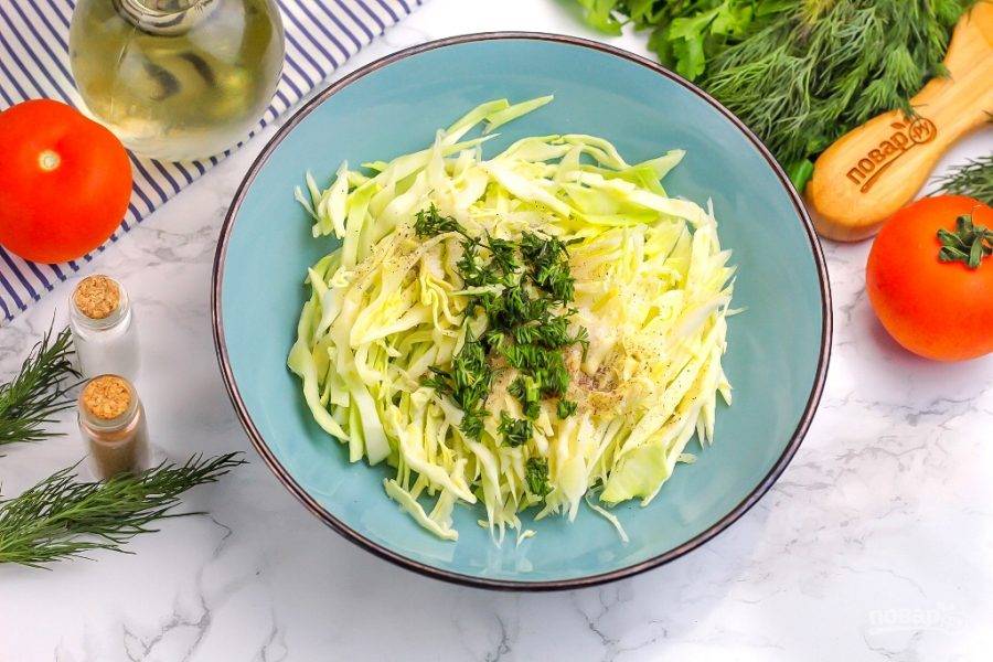 Нашинкуйте капусту в салатник или миску, нарежьте зелень укропа и добавьте половину к капусте вместе с щепоткой соли и щепоткой молотого черного перца. Аккуратно протрите рукой, перемешивая, чтобы из капусты выделился сок. Влейте 1 ч.л. растительного масла и перемешайте.