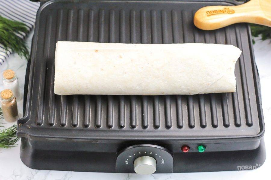 Разогрейте электрогриль или сковороду-гриль и выложите на панель заготовку шаурмы. Обжаривайте на электрогриле 4-5 минут, на сковороде под прессом по 3-4 минуты с каждой стороны на среднем нагреве.