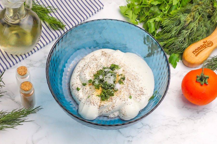 Сметану или густой йогурт любой жирности выложите в пиалу, миску и спрессуйте туда зубчики чеснока. Всыпьте соль, молотый перец и оставшуюся нарезанную зелень укропа. Аккуратно все перемешайте.
