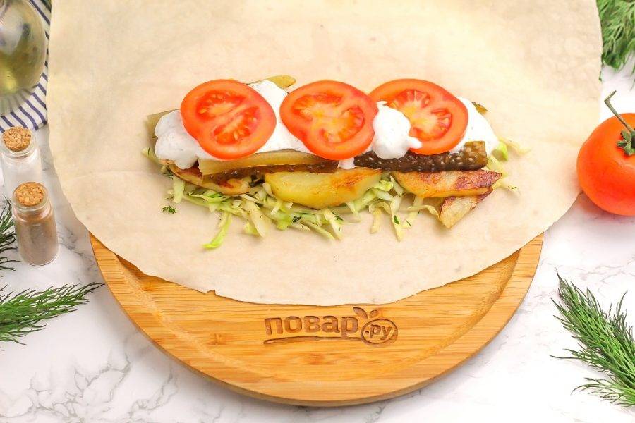Дополните соусом и красочными кружочками помидора. По желанию можно присыпать различными специями и пряностями. Помните, что соуса должно быть достаточно, чтобы шаурма не получилась суховатой на вкус.
