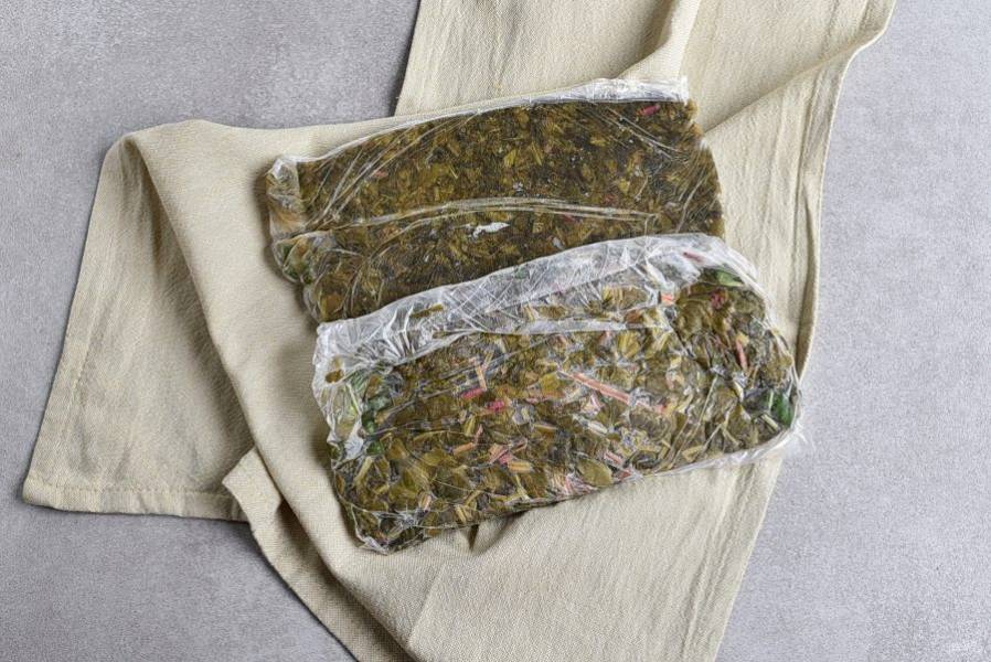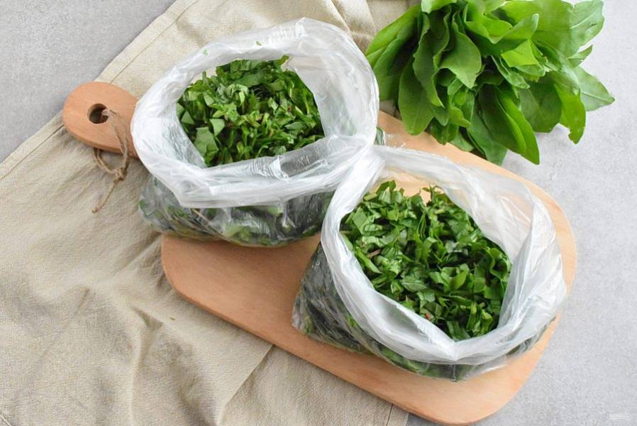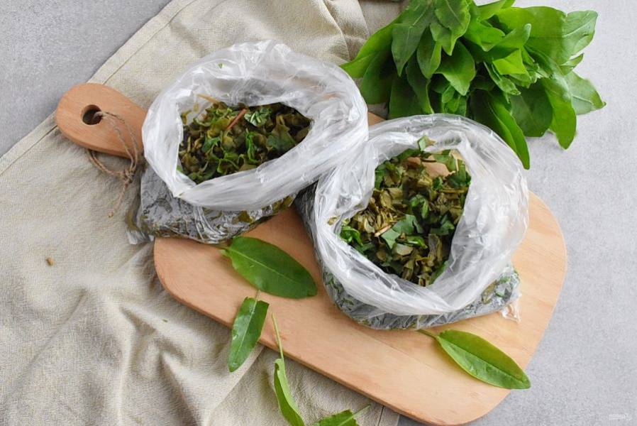 Дайте щавелю остыть. Такая обработка предотвратит высыхание щавеля в морозилке, что порой бывает, если замораживать просто нарезку. Подверните края пакета и закрепите скотчем или плотно завяжите.