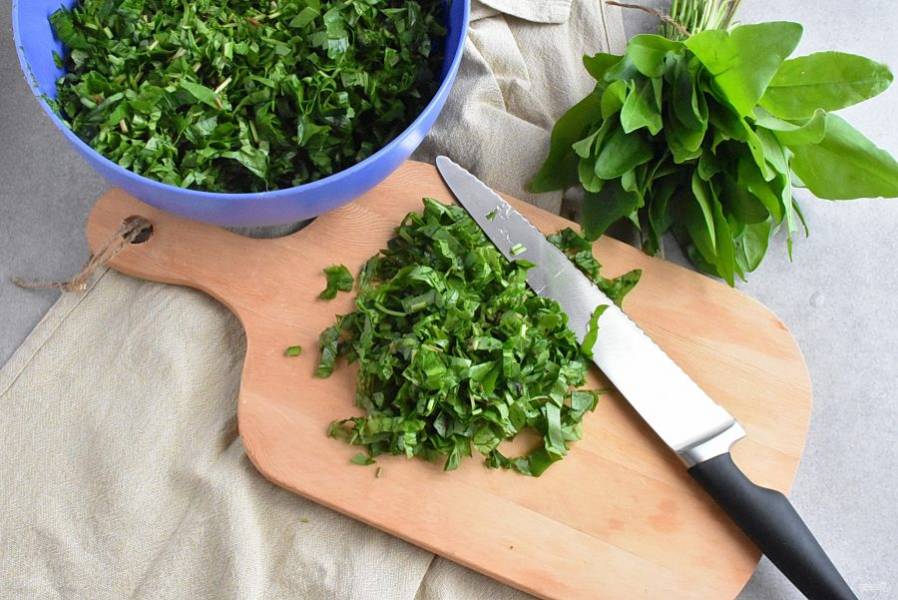 Заранее промытый и обсушенный щавель нашинкуйте.