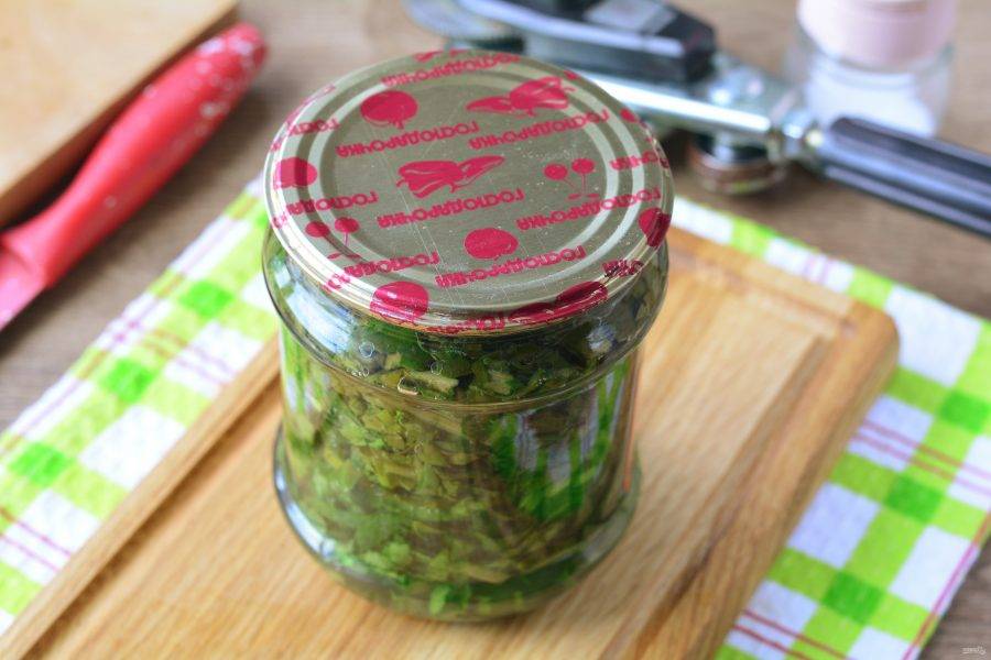 Храните заготовку в темной кладовой или в погребе. Выход готового продукта — одна банка объемом 0,5 литра.