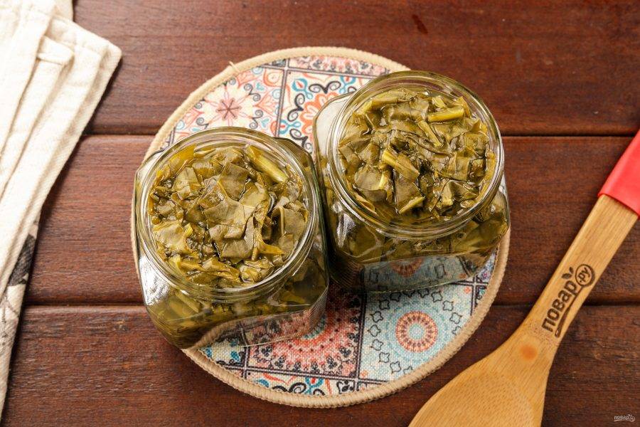Затем при помощи шумовки или обычной ложки с дырочками, переложите щавель в подготовленные стерилизованные банки.