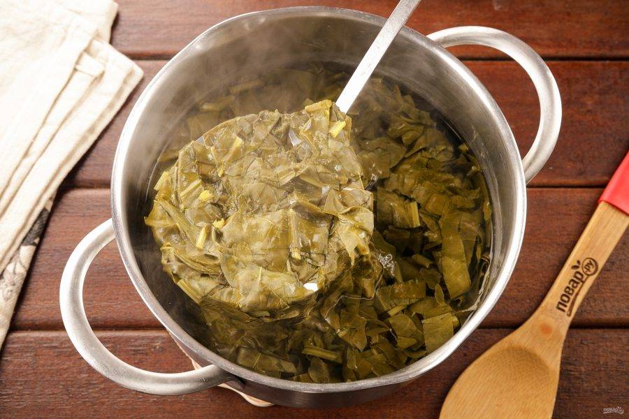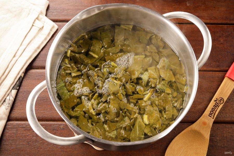 Затем складывая щавель стопочкой, нарежьте, как вы обычно режете его для зеленого борща.
