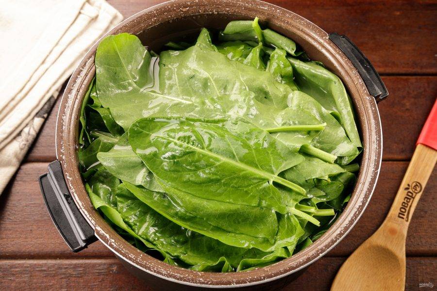 Щавель тщательно промойте в большом количестве воды. Для этого поместите его в широкую ёмкость и залейте водой, удаляя грубые черенки. Несколько раз смените воду.