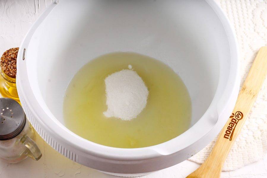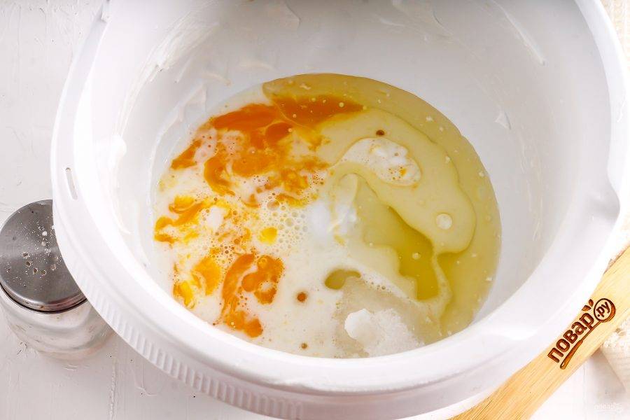 Выложите белки в отдельную сухую миску и влейте в чашу куриные желтки, всыпьте сахар, добавьте растительное масло без аромата и теплое, но не горячее молоко. Всыпьте соль.