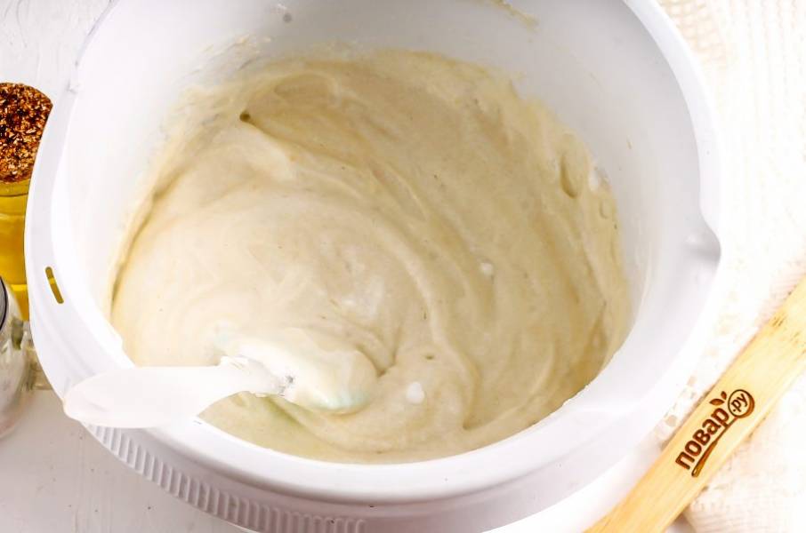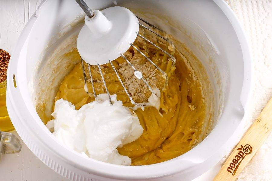 Добавьте в чашу треть взбитых белков и аккуратно вмешайте их в тесто на минимальной скорости.