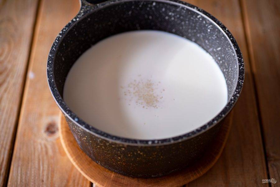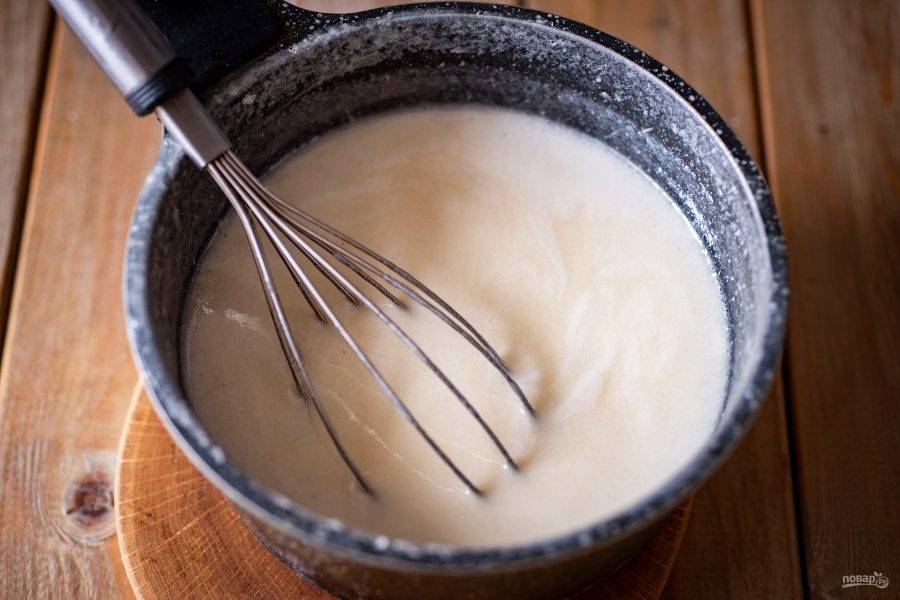 Варите на небольшом огне с момента закипания 30 минут, постоянно помешивая венчиком или ложкой. В районе тридцатой минуты смесь должна приобрести кремовый оттенок.