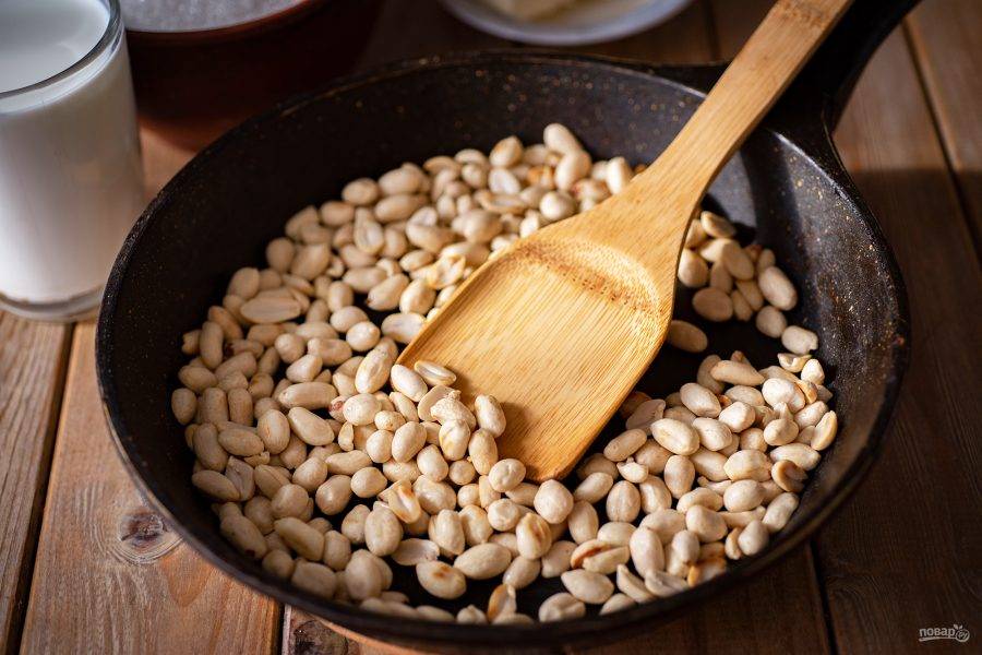 В сухой сковороде на небольшом огне обжарьте арахис до легкого золотистого оттенка.