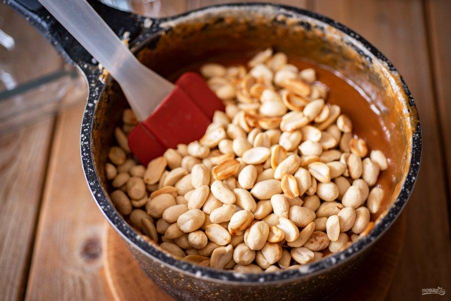 Затем добавьте арахис и перемешайте все, равномерно распределяя.