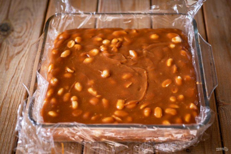 Удобную форму застелите пищевой пленкой и выложите всю массу из сотейника в форму, разравнивая ее ложкой. Масса очень быстро застывает.