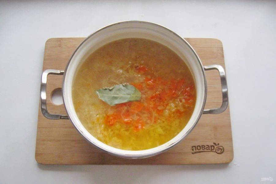 На этом этапе можно добавить лавровый лист, соль и перец по вкусу.