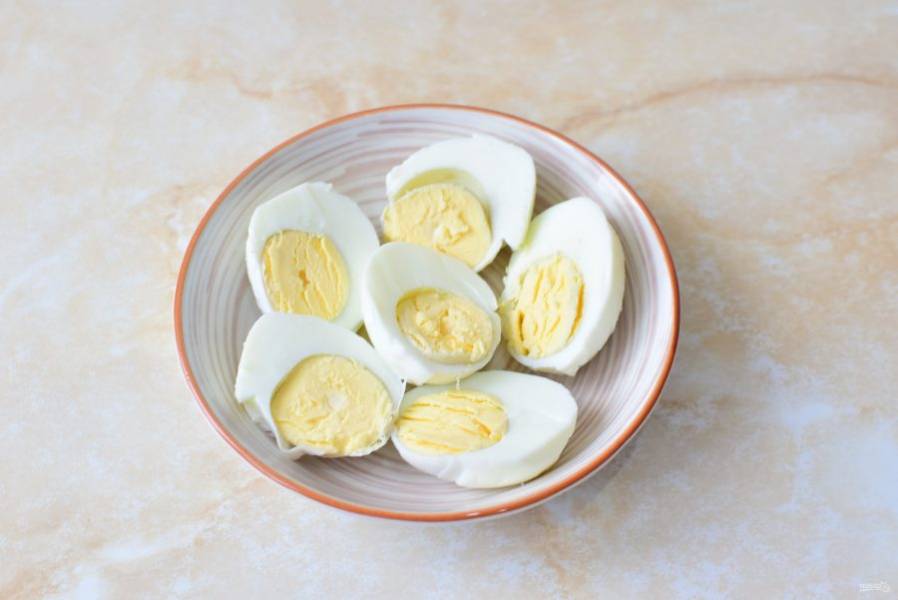 Яйца отварите, очистите и разрежьте каждое на 2 части.