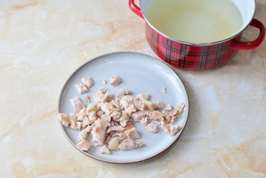 Куриное мясо отварите в кипящей воде, примерно 20 минут. Затем мясо измельчите и верните в бульон. Доведите все до кипения.
