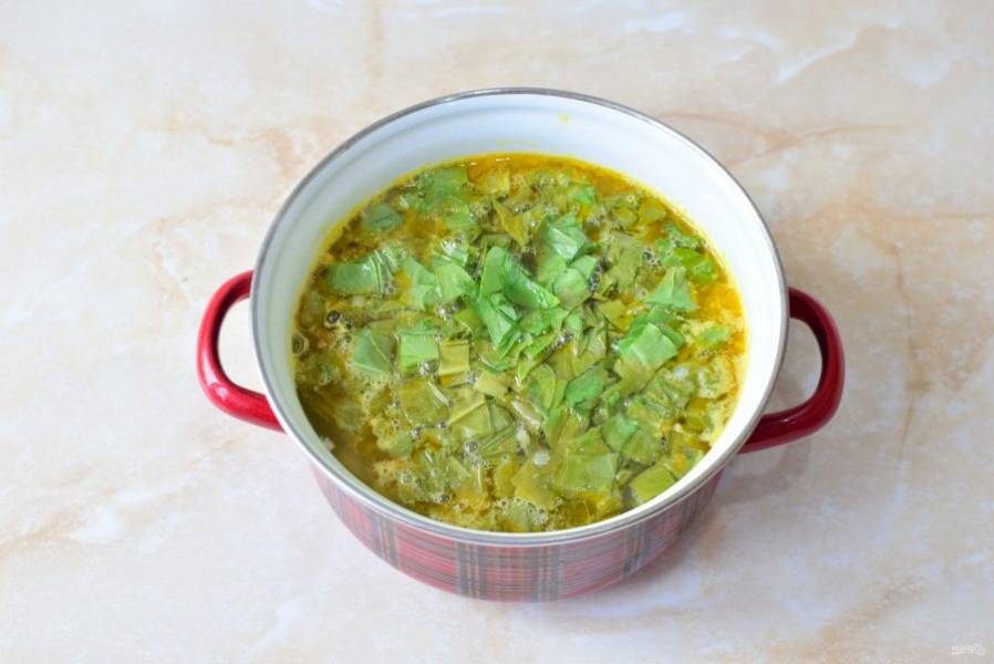 Добавьте щавель в суп. Доведите до кипения и снимите с огня. Оставьте под крышкой немного настояться.