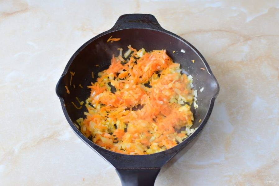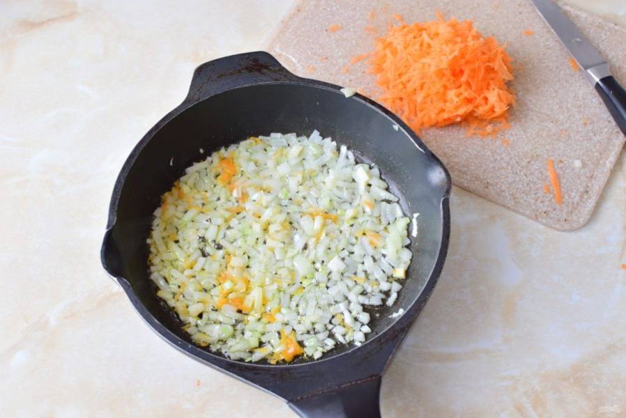 Очистите лук и морковь. Потрите морковь на терке, а лук мелко нарежьте. Обжарьте лук, буквально 1 минуту, чтобы от него появился характерный аромат.