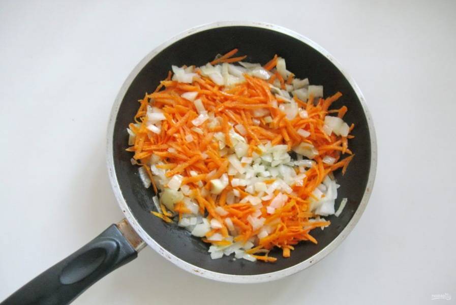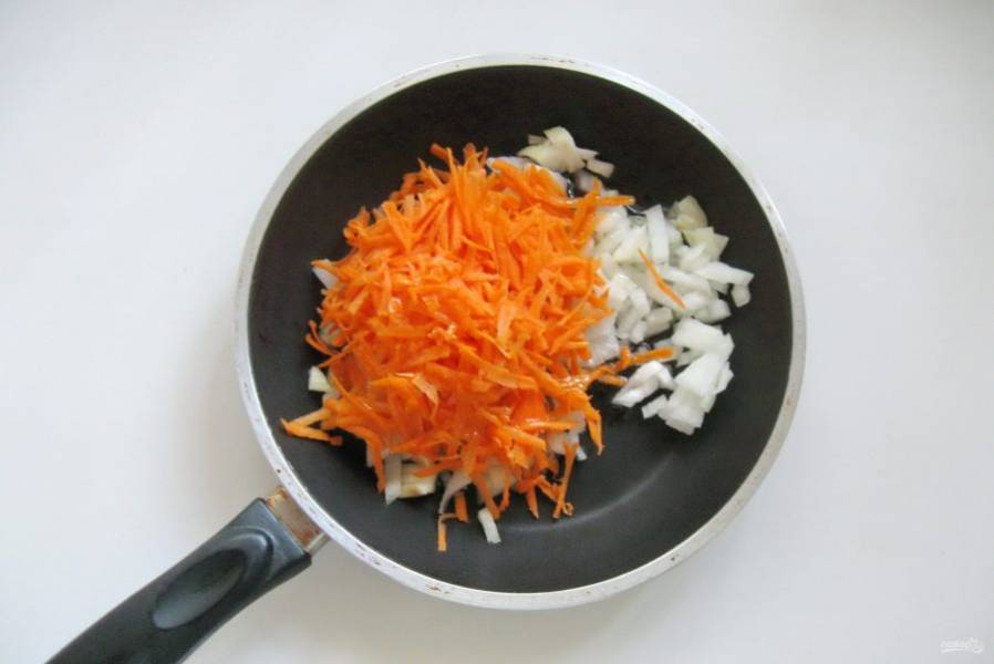 Морковь и лук очистите, помойте. Лук мелко нарежьте, а морковь натрите на терке. Выложите в сковороду.