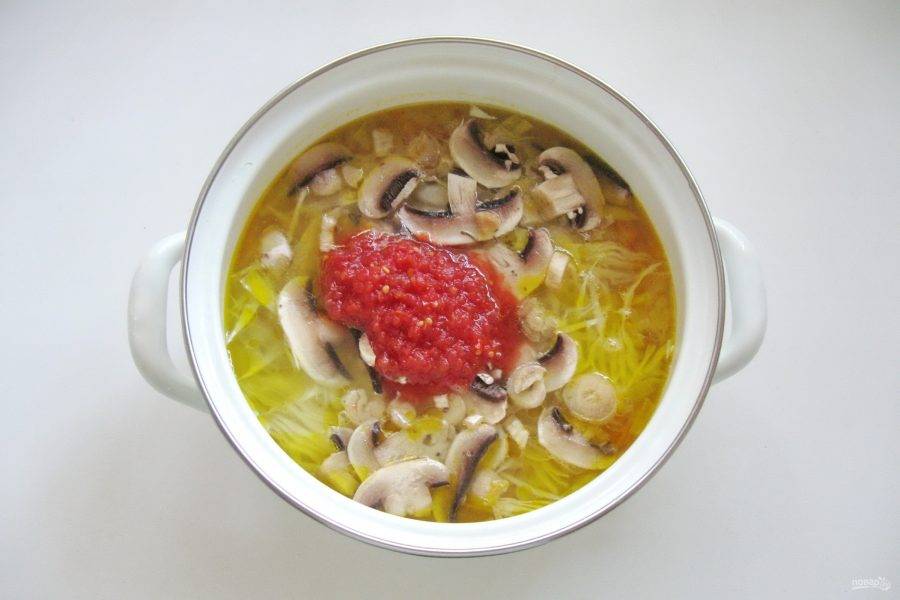 Помидоры помойте, измельчите любым способом. Добавьте в кастрюлю.