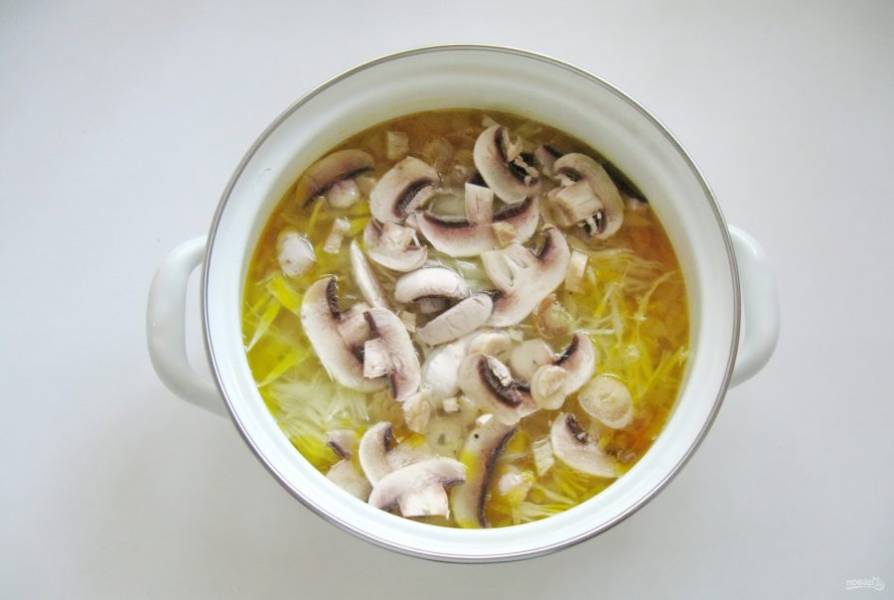 Шампиньоны очистите и нарежьте. Выложите в щи.
