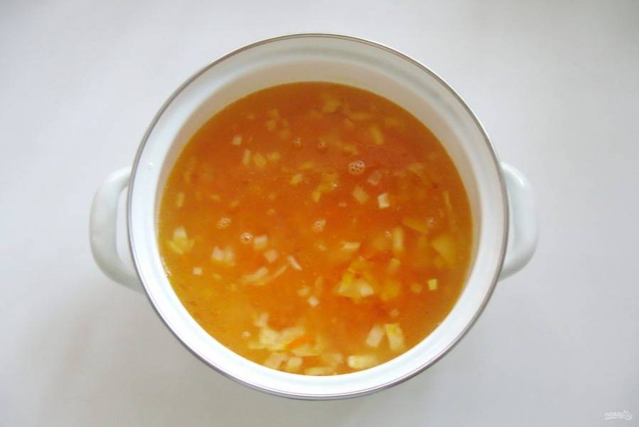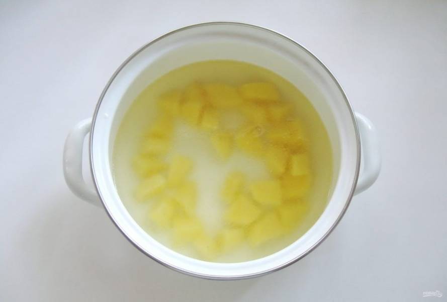 В кастрюлю налейте куриный бульон. Картофель очистите, помойте и нарежьте кубиками. Выложите в бульон.