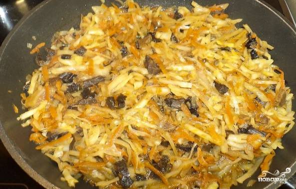 Добавьте к грибами лук с морковью, обжаривайте до прозрачности лука.