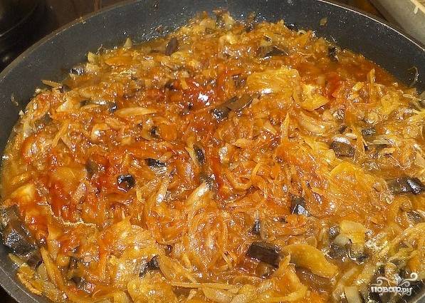 Добавьте квашеную капусту в сковороду. Через пару минут добавьте 3 ложки томатной пасты и тушите все еще 20 минут.