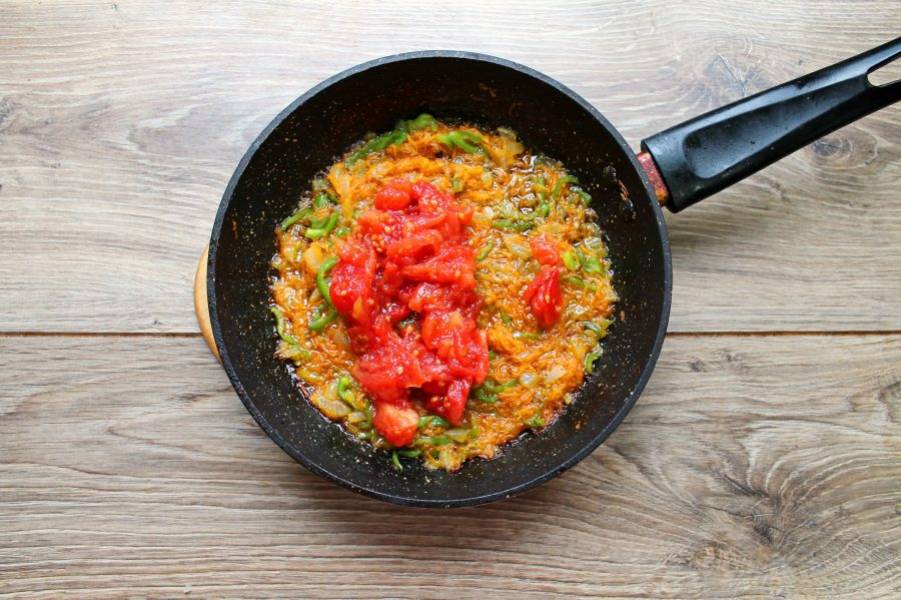 С консервированных помидоров снимите кожицу, порежьте и добавьте к овощам. Обжаривайте все еще 5-7 минут, перемешивая.