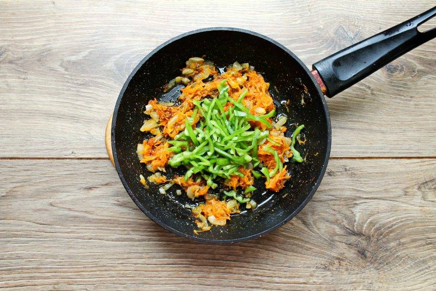 Болгарский перец очистите от плодоножки и семян, порежьте соломкой и добавьте в сковородку. Обжаривайте все в течение 5 минут.