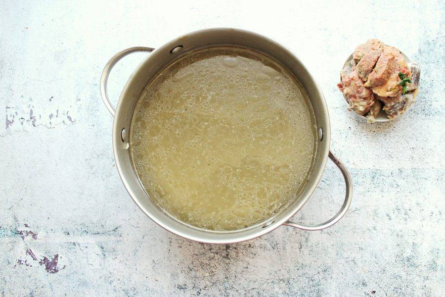 Спустя время достаньте из кастрюли кость и остудите. Бульон процедите, отварные овощи нам не понадобятся. С кости снимите отварное мясо.