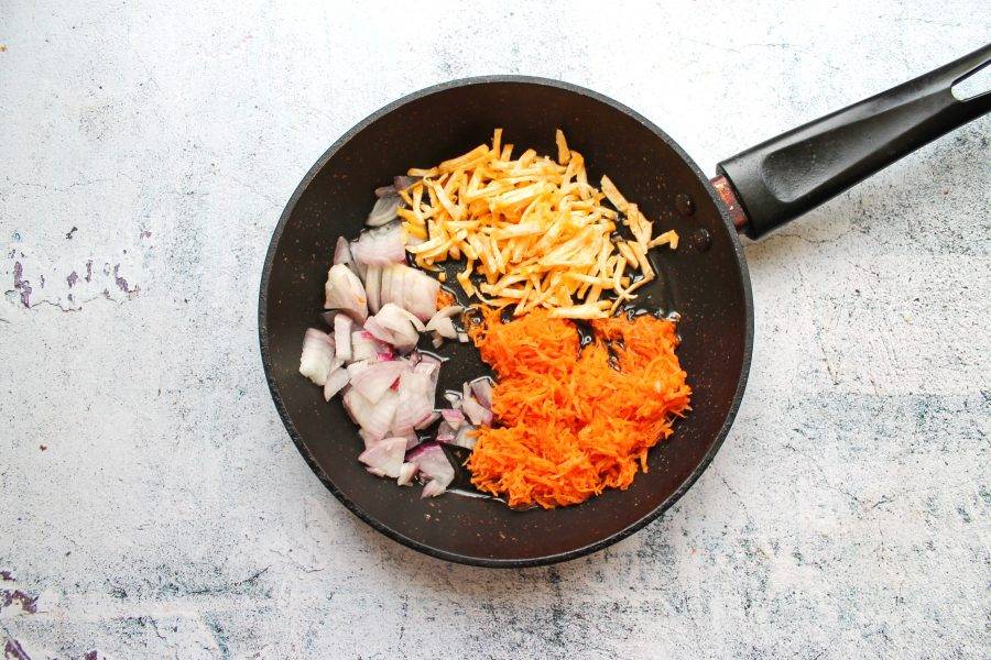 Пока варится капуста, натрите морковь на средней терке, порежьте репчатый лук. Репу очистите от кожуры, порежьте соломкой. В сковороду налейте растительное масло, выложите овощи и обжаривайте на среднем огне в течение 5-7 минут.