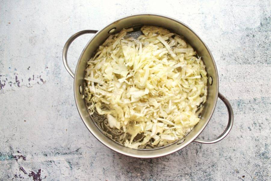 Бульон доведите до кипения на среднем огне, посолите. Капусту тонко нашинкуйте и выложите в кастрюлю с бульоном, варите в течение 10 минут.