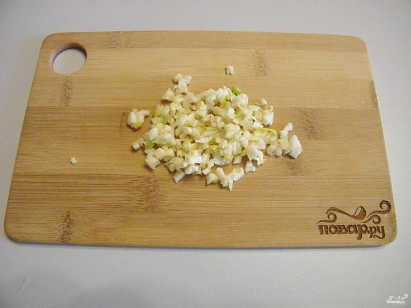 Порубите мелко ножом 3-4 зубчика чеснока.