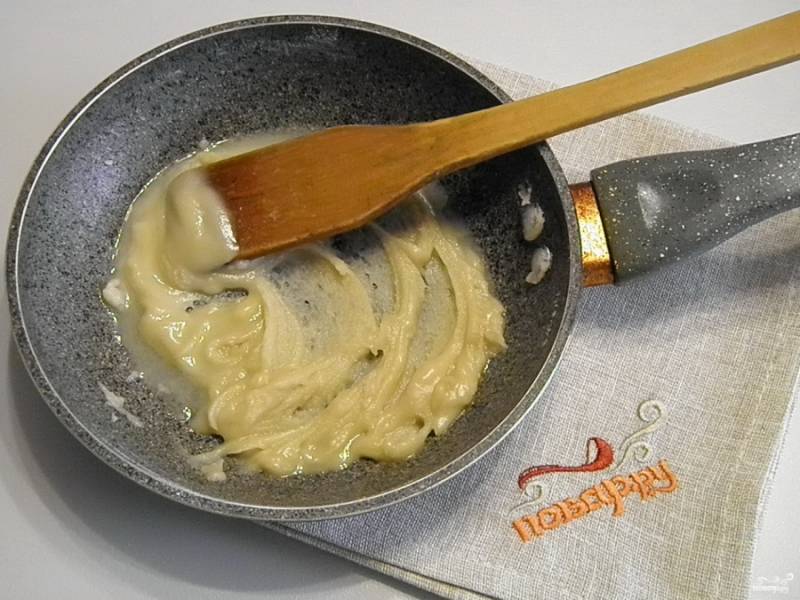 Сделайте мучную заправку. Для этого налейте масло растительное и всыпьте муку. На медленном огне прожарьте муку до кремового цвета. Перемешивайте постоянно, чтобы ваша заправка не подгорела.