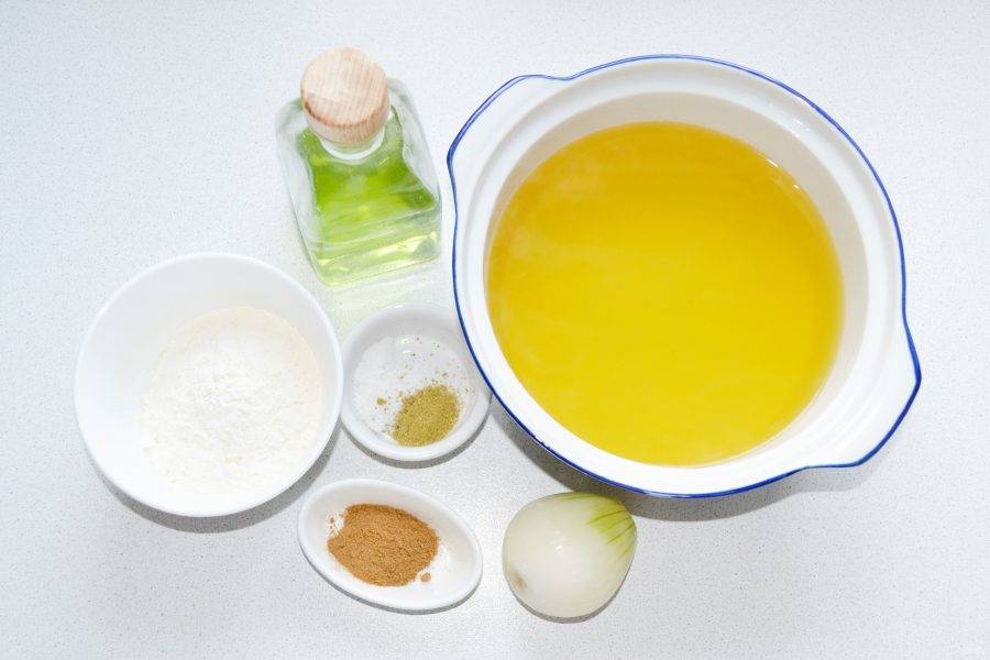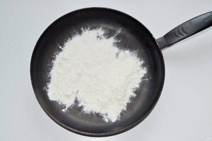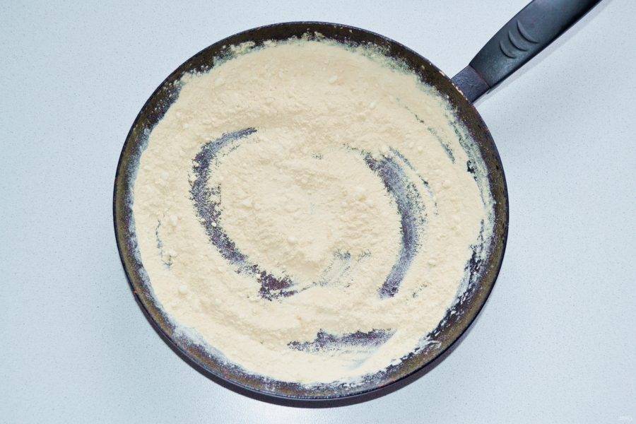 На сухую сковороду выложите муку и отправьте на средний огонь. Обжарьте, постоянно помешивая, до румяного цвета.