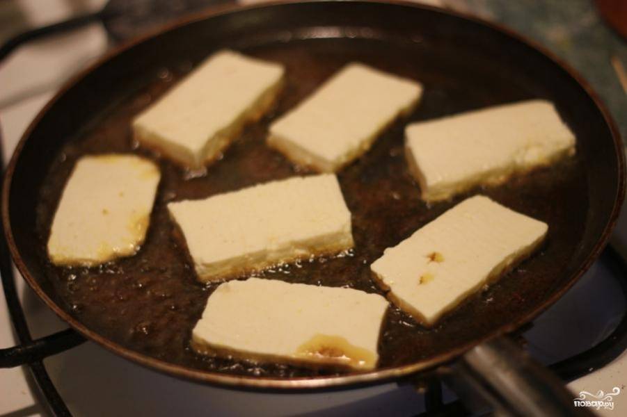 Затем на сковородку выложить нарезанный слайсами адыгейский сыр.